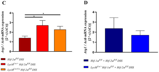 The anti-inflammatory cytokine IL10 is mainly produced by T-cells and can inhibit proinflammatory responses of the innate and the adaptive immune system [37] whereas TGF-β1 most potently inhibits Th1 answers but can also induce the generation of Th17 together with IL6. In Figure 10A (right of broken line), no differences were observed between the Il10 and Tgfb1 expression in the colon of DSS-treated Hif-2αfl/fl animals and the respective control group. Samples from DSS-treated LysMCre/+ Hif-2αfl/fl and LysMCre/Cre Hif-2αfl/fl animals in contrast showed an increased expression of Il10 and a higher expression of Tgfb1 compared to either the respective control group or to samples of DSS-treated Hif-2αfl/fl animals. In the samples from DSS-treated Hif-1αfl/fl × Hif-2αfl/fl and LysMCre/+ Hif-1αfl/fl × Hif-2αfl/fl animals no differences in Il10 expression were observed compared to samples from non-treated animals (Figure 10B; right of broken line). The mRNA of Arginase-1 (arg-1, Figure 10 C,D), an enzyme that has been described as target gene of HIF-2 was surprisingly induced instead of reduced in DSS treated LysMCre/+ Hif-2αfl/fl and LysMCre/Cre Hif-2αfl/fl animals and unaltered in DSS treated LysMCre/+ Hif-1αfl/fl × Hif-2αfl/fl mice. Summarizing these data, a higher colon inflammation caused by the myeloid HIF-2 knockout was likely to demand a higher anti-inflammatory response to compensate the otherwise overwhelming inflammation.