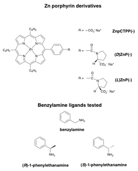 Chosen as one of external chiral amine, the intensity of the CD spectral features are similar, within the experimental errors, for both the (L)ZnP(-) and (D)ZnP(-) confirming the overwhelming effect of the stereochemistry of the nitrogen ligand. It is known, in fact, that the binding affinity of zinc-tetraarylporphyrin derivatives to external ligands correlates well with the basicity of the donor atom, following the general order P; S < O < N [40]. In particular, benzylamine derivatives should feature much higher affinity with respect to the proline carboxylate group, the pKa of their neutral form (298 K in water) being 9.3 and 1.95, respectively.