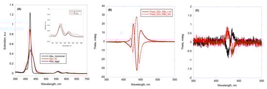 The co-aggregation experiments have been also carried out on the achiral Zn-porphyrin analogue (ZnpCTPP(-); Chart 1) in order to prove the induction effect of the metal coordination by the chiral phenylethanamines. In this case, UV-Vis results showed a fast formation of aggregated structures (Figure 2A); alongside, the corresponding CD spectra showed the formation of weak bisignated coupled features, whose signs are dependent on the stereochemistry of the added chiral inductor, namely +/− with the (S)-1-phenylethanamine, and −/+ with the (R)-1-phenylethanamine (Figure 2B).