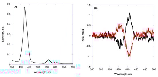 (A) UV-Vis of ZnpCTPP(-) 5.0 μM aggregates (EtOH/H2O 25:75 v:v; 298 K) in the presence of (S)-1-phenylethanamine 5.0 × 10−4 M. The spectrum obtained in the presence of (R)-1-phenylethanamine is virtually superimposable. (B) CD spectra of ZnpCTPP(-) 5.0 μM (EtOH/H2O 25:75 v:v; 298 K) in the presence of (S)-1-phenylethanamine 5.0 × 10−4 M (black trace); (R)-1-phenylethanamine 5.0 × 10−4 M (red trace).
