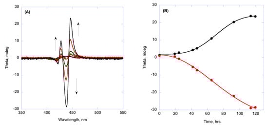 (A) CD spectral changes (Type-II aggregates evolution) with time of (L)ZnP(-) 5 μM (EtOH/H2O 25:75 v:v) in the presence of (S)-1-phenylethanamine 5.0 × 10−4 M. (B) Corresponding calculated fit (Equation (1)) at the wavelength maxima of the lower energy bands: λ = 446 nm (black circles); λ = 438 nm (red circles).