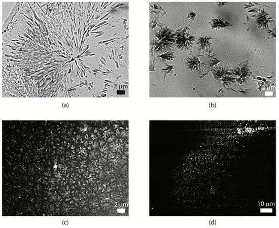 Microscope transmission images of drop casted equilibrium solution on glass of (a) (D)ZnP(-)@(R)-1-phenylethanamine solution; (b) freshly drop casted equilibrium solution with wet precipitate (see text). Fluorescence emission image of drop casted equilibrium solution of (c) ZnpCTPP(-)@(R)-1-phenylethanamine, and (d) ZnpCTPP(-) aggregates.