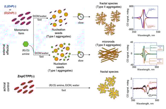 The following are available online at https://www.mdpi.com/1422-0067/21/22/8557/s1, Scheme S1: Scheme of the synthesis of the compounds used in the work, Figure S1: CD spectra of equilibrium solutions of (D)ZnP(-) and (L)ZnP(-) in the presence of (R)-1-phenyl-ethanamine and (S)-1-phenyl-ethanamine, Figure S2: UV-Vis and CD spectra of the aggregates of (D)ZnP(-) in the presence of achiral benzylamine, Figure S3: UV-Vis spectral variations with time of (L)ZnP(-) in the presence of (R)-1-phenyl-ethanamine, and corresponding kinetic plot, Figure S4: UV-Vis and CD spectral variations with time of (L)ZnP(-) (10 μM) in the presence of (R)-1-phenyl-ethanamine (1.0 × 10−3 M), Figure S5: SEM topographies of precipitates from 10 μM equilibrium solutions of (D)ZnP(-) (A) and (L)ZnP(-) (B) in the presence of (S)-1-phenylethanamine, Figure S6: Microscope transmission and fluorescence emission images of drop casted equilibrium solution on glass of (D)ZnP(-)@(R)-1-phenylethanamine solution.