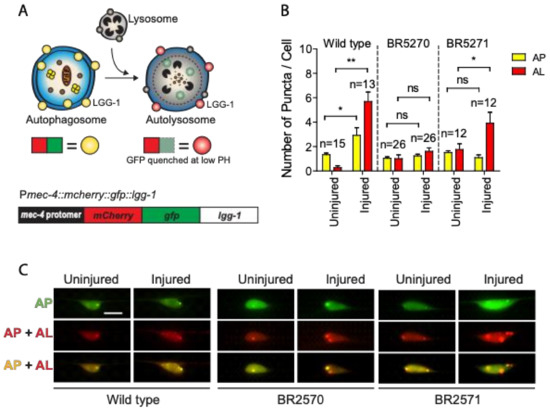 Figure 1. Axon injury-induced autophagic induction is impaired in transgenic Tauopathy models. (A) Schematic diagram showing the mCherry::GFP::LGG-1 reporter specifically expressed in PLM touch neuron. (B,C) Quantification and representative images of PLM cell body of wild type, BR5270 and BR5271 animals expressing Pmec-4-mCherry::GFP::LGG-1. PLM axon was axotomized on Day 1 of adulthood. Images were taken immediately before axotomy (Uninjured) and 24 h post axotomy (injured). AP, autophagosome; AL, autolysosome. Scale bar: 10 µm. Statistics: one-way ANOVA; mean ± SEM; * p < 0.05; ** p < 0.01; ns, Not significant.