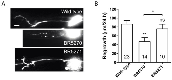 57. Wu, Z.; Ghosh-Roy, A.; Yanik, M.F.; Zhang, J.Z.; Jin, Y.; Chisholm, A.D. Caenorhabditis elegans neuronal regeneration is influenced by life stage, ephrin signaling, and synaptic branching. Proc. Natl. Acad. Sci. USA 2007, 104, 15132–15137. [Google Scholar] [CrossRef] [PubMed]