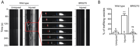 Figure 3. Injury induces autophagic vesicles trafficking in wild-type animals but not in tauopathy models. (A) Representative kymograph of autophagic vesicles movement in touch neuron (visualized with Pmec-4-mCherry::GFP::LGG-1 reporter); each arrow (red, blue, and white) indicate autophagic vesicles on PLM axon. Kymographs were generated by Olympus IX83 software from movies taken immediately before axotomy (Uninjured) and 24 h post axotomy (injured). (B) Quantification of trafficking % (number of trafficking vesicles/total vesicles in 50 µm region of proximal PLM axon) for experiments in (A). Statistics: one-way ANOVA; mean ± SEM; *** p < 0.001; ns, Not significant.