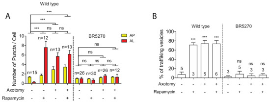 Figure 4. Defects in autophagic induction and trafficking are not rescued by Rapamycin. (A) Quantification of autophagosomes (APs) and autolysosomes (ALs) in PLM cell bodies with indicated treatments. Rapamycin or axotomy alone was sufficient to enhance the numbers of APs and ALs in PLM neurons of wild type. In contrast, neither rapamycin nor axon injury was able to induce the formation of autophagic vesicles in PLM neurons of the Tauopathy model. (B) Quantification of autophagic vesicles movement in the PLM axons with indicated treatments. Rapamycin or axotomy alone was sufficient to enhance trafficking in wildtype animals, but not in BR5270. Statistics: one-way ANOVA; mean ± SEM; *** p < 0.001; ns, Not significant.