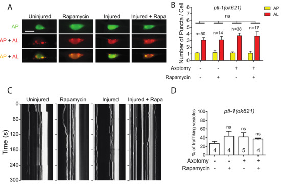 Figure 5. Defective autophagic induction and trafficking in ptl-1 mutant. (A,B) Representative images and quantification of APs and ALs in PLM cell bodies of ptl-1(ok621) expressing Pmec-4-mCherry::GFP::LGG-1 with indicating treatment. Rapamycin treatment did not rescue the autophagic activity in PLM neurons of the ptl-1 mutant animals. Scale bar: 10 µm. (C) Representative kymograph of autophagic vesicles movement in touch neuron with indicating treatment. Axotomy or axotomy with rapamycin treatment did not enhance the movement of the autophagic vesicles on the PLM axon of ptl-1(ok621). (D) Quantification of autophagic vesicles movement in the PLM axons with indicated treatments (measured as number of trafficking vesicles/total vesicles on PLM axon). Statistics: one-way ANOVA; mean ± SEM; ns, Not significant.
