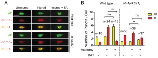 Figure 6. The high basal level of autolysosomes in the ptl-1 mutant is less sensitive to BA1 compared to wild type. (A) Representative images of both wild-type and pt1-1(ok621) transgenic PLM cell bodies, expressing Pmec-4-mCherry::GFP::LGG-1, 24 h post axotomy. Images taken with and without injection of 50µM of BA1 into tail region. Treatment occurred at day 1 of adulthood 1 h before axotomy. BA1 suppressed autolysosome formation in injured wild-type neurons, but not in ptl-1(ok621) mutants. Scale bar: 10 µm. (B) Quantification of APs and ALs in PLM cell bodies for experiments in (A). Statistics: one-way ANOVA; mean ± SEM; ** p < 0.01; *** p < 0.001; ns, Not significant.
