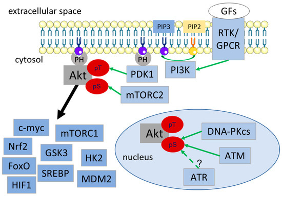 The biochemical processes responsible for activation of Akt and major physiological targets are well known and will only be summarized briefly here (Figure 1). Activation of PI3K by, e.g., receptor tyrosine kinases (RTKs) or G-protein coupled receptors (GPCRs), leads to the generation of phosphatidylinositol-3,4,5-trisphosphate (PIP3) in the cytoplasmic membrane; this mediates recognition and recruitment of Pleckstrin Homology (PH) domain-containing proteins to PIP3-rich regions in the cytoplasmic membrane, such as Akt, phosphoinositide-dependent kinase 1 (PDK1) or PH-domain containing phosphatases [50,59,60,61,62,63]. Co-localization of PDK1 and Akt at the membrane facilitates PDK1-dependent phosphorylation of Akt at Thr308 [50]. The second activation-associated phosphorylation site at Ser473 undergoes compartment-specific phosphorylation through either mammalian target of rapamycin (mTORC2) (cytosol), integrin linked kinase (focal adhesion), or DNA-dependent protein kinase catalytic subunit (DNA-PKcs), ataxia telangiectasia mutated (ATM) and presumably also ataxia telangiectasia and Rad3 related (ATR) (nucleus), leading to its full activation (Figure 1) [64,65,66,67,68,69,70] (for a detailed review see [50,51]).