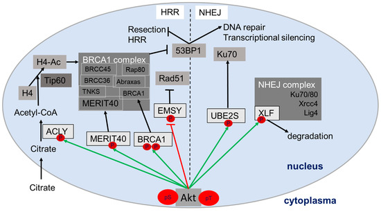 Schema of direct and indirect Akt-dependent regulation of various proteins in the nucleus involved in homologous recombination repair (HRR) or non-homologous end-joining (NHEJ). Akt target proteins are indicated in light grey, Akt-dependent activation/stabilization with green arrows and Akt dependent deactivation/degradation with red block arrow. Black lines indicate subsequent reaction steps in signaling (metabolic reaction, posttranslational modification, degradation). For details about the assumed consequences for the action of the nuclear Akt target proteins see main text paragraph 2. Abbreviations: tumor suppressor p53-binding protein (53BP1); ATP-citrate lyase (ACLY); Breast cancer type 1 susceptibility protein (BRCA1); BRCA1/BRCA2-containing complex (BRCC); BRCA2-interacting transcriptional repressor (EMSY); histone 4 (H4); ligase 4 (lig4); mediator of Rap80 interactions and targeting 40 kDa (MERIT40); receptor-associated protein 80 (Rap80); tankerase (TNKS); Ubiquitin conjugating enzyme E2 S (UBE2S); XRCC4-like factor (XLF); X-ray repair cross-complementing protein 1 (Xrcc4).