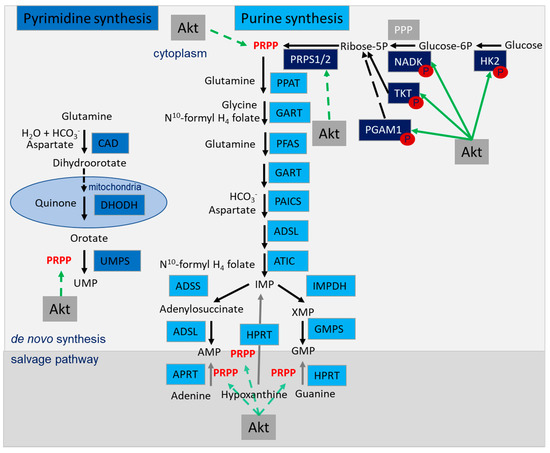Nucleotide synthesis pathway: de novo synthesis of pyrimidines and purines and salvage pathway, utilizing phospho-ribose pyrophosphate (PRPP) produced in Akt-regulated pathways to generate uridine monophosphate (UMP), adenosine monophosphate (AMP) and guanosine monophosphate (GMP). Enzymes of the pyrimidine synthesis in light blue, enzymes of the purine synthesis in turquoise, enzymes involved in generating PRPP in dark blue. Akt-dependent activation is marked with green arrows, the metabolic pathway of de novo synthesis is marked with black arrows and the salvage pathway is marked with grey arrows. Abbreviations: pyrimidine synthesis: carbamoyl-phosphate synthetase (CAD), dihydroorotase, dihydroorotate dehydrogenase (DHODH), uridine monophosphate synthetase (UMPS); purine synthesis: adenylosuccinate lyase (ADSL), 5-aminoimidazole-4-carboxamide ribonucleotide formyltransferase (ATIC), glycinamide ribonucleotide transformylase (GART), phosphoribosylaminoimidazole carboxylase and phosphoribosylamino-imidazolesuccinocarboxamide synthase (PAICS), phosphoribosyl-formylglycinamidine synthase (PFAS), phosphoribosyl pyrophosphate amidotransferase (PPAT); the salvage pathway: adenylosuccinate synthase (ADSS), adenine phosphoribosyltransferase (APRT) guanine monophosphate synthase (GMPS), hypoxanthine phosphoribosyltransferase (HPRT), inosine monophosphate dehydrogenase (IMPDH); generation of PRPP; hexokinase 2 (HK2), NAD kinase (NADK), phosphoglycerate mutase 1 (PGAM1), pentose phosphate pathway (PPP), ribose-phosphate pyrophosphokinase 1/2 (PRPS1/2), transketolase (TKT).