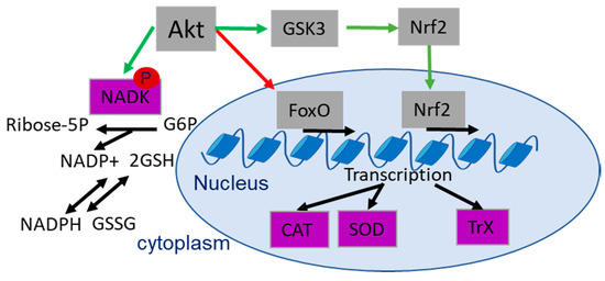 Various reports indicate a role of Akt in the regulation of the cellular antioxidant capacity and therapy outcome [148]: cells with active Akt tend to dispose of a high antioxidant capacity [110,149,150]. The involved processes include Nrf2-dependent induction of the thioredoxin (Trx) and glutathione-glutaredoxin (GrX) systems to enhance the production of NADPH [151] and GSH, respectively [108,148]. Furthermore, Akt directly phosphorylates its target protein NAD kinase (NADK) on Ser44, Ser46 and Ser48 [151]. Activating phosphorylation increases the NADK-dependent production of NADP+, and this is a prerequisite for GSH-dependent production of NADPH [151,152] (Figure 4). On the other hand, Akt-dependent phosphorylation of FoxO transcription factors reduces FoxO-dependent transcription of the antioxidant enzymes catalase (CAT) and mitochondrial superoxide dismutase (SOD2), thereby balancing antioxidant defense [18,110,153,154,155] (Figure 4).