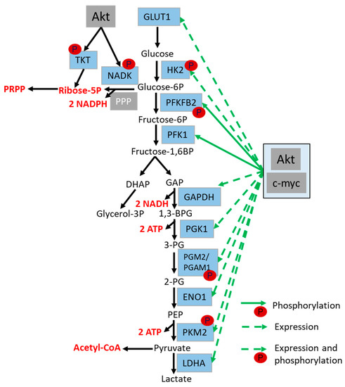 Schematic representation of major steps of glycolysis and direct and indirect regulation of glycolytic enzymes (in light blue) via Akt. Direct regulation of glycolysis occurs via Akt-mediated phosphorylation of glycolytic enzymes, whereas indirect regulation takes place via Akt-mediated c-myc activation. Akt and c-myc mediated activation are indicated with green arrows, the metabolic pathway is indicated with black arrows and the generated metabolites are marked in red. Abbreviations: 1,3-bisphosphogylcerate (1,3-BPG), Adenosine triphosphate (ATP), dihydroxyacetone phosphate (DHAP), enolase (ENO1), Glycerine aldehyde phosphate (GAP), Glyceraldehyde 3-phosphate dehydrogenase (GAPDH), Glucose transporter (GLUT), Hexokinase 2 (HK2), lactate dehydrogenase (LDHA), Nicotinamide adenine dinucleotide (NADH), NAD kinase (NADK), Nicotinamide adenine dinucleotide phosphate (NADPH), Phosphoenolpyruvic acid (PEP), pentose phosphate pathway (PPP), Phospho-fructo-kinase (PFK1), phosphoglycerate kinase 1 (PGK1), phosphoglycerate mutase 1 (PGAM1), transketolase (TKT).