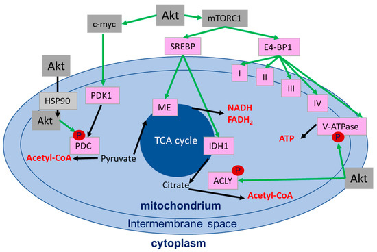 Schematic representation of the direct and indirect regulation of mitochondrial enzymes (in pink) by Akt. Akt-regulated activation is indicated with green arrows, metabolic processes are indicated by black arrows and the generated metabolites are shown in red. Abbreviations: ATP-citrate lyase (ACLY), heat shock protein 90 (HSP90), isocitrate dehydrogenase 1 (IDH1), malic enzyme (ME), mechanistic target of rapamycin/mammalian target of rapamycin (mTORC1), pyruvate dehydrogenase complex (PDC), pyruvate dehydrogenase kinase 1 (PDK1), sterol regulatory element binding proteins (SREBP).