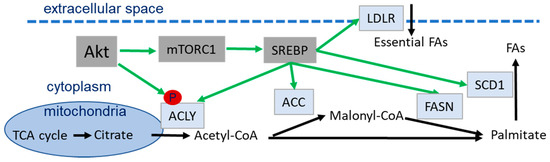 Akt-dependent activation of SREBP leads to the transcription of proteins involved in fatty acid synthesis, e.g., ATP citrate lyase (ACLY), acetyl-CoA carboxylase (ACC), fatty acid synthase (FASN), stearoyl-coenzyme A desaturase 1 (SCD1) and low density lipoprotein receptor (LDLR); moreover, it leads to the generation of NADPH, an essential co-factor in fatty acid production, and pathways required to convert acetate and glutamine into acetyl-CoA (Figure 7) [191,192,195,196].