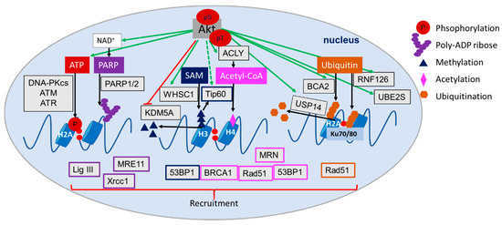 Overall, these observations support the important and multifaceted roles of Akt in regulating the posttranslational modifications of DDR and DNA repair proteins and thereby of the dynamics of DNA repair processes. Herein, Akt directly and indirectly regulates the activity of metabolic enzymes, the production of metabolites as well as the expression, localization, stability or activity of epigenetic enzymes with relevance to the DDR and DSB repair (Figure 8).