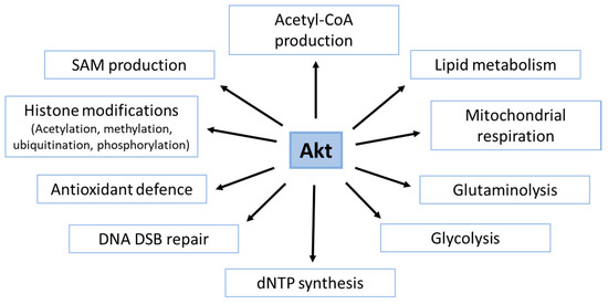 Akt regulates various metabolic processes that are involved in the production of metabolic co-factors with potential impact on DDR and DSB repair, e.g., acetyl-CoA and SAM, respectively. (i) As described in Section 3.3, acetyl-CoA is generated from citrate or pyruvate in the TCA cycle [209] and is used for the acetylation of proteins and chromatin during the DDR [202,210,211]. In this context, Akt is involved in the regulation of citrate and pyruvate production by glycolysis and mitochondrial metabolism, and in the generation of acetyl-CoA from citrate via ACLY or from pyruvate via PDC [48,190]. This Akt-dependent provision of acetyl-CoA can support acetylation processes including histone acetylation and lead to improved HRR [202]. (ii) Akt-dependent phosphorylation of GSK3β impacts phosphorylation of histone-acetylase Tip60, which is essential for its acetylase function [211]. (iii) The interaction between specific histone deacetylases, e.g., SIRT1 and HDAC1/3/6, and Akt allows an interactive and fast regulation of histone acetylation signals through the regulation of Akt’s activation state [212,213,214].
