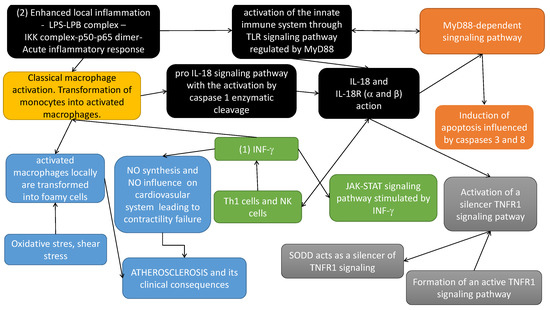 - (yellow box in Figure 2) Classical macrophage activation occurs in response to the action of: (1) IFN- (originally called macrophage-activating factor) and (2) lipopolysaccharide (LPS) (enhanced (severe) local inflammation-LPS-LPB complex-IKK complex phosphorylated and initiation cascade of phosphorylation leading finally to the translocation of p50–p65 to the nucleus and gene transcription of many inflammatory cytokines that activate inflammatory cascade).