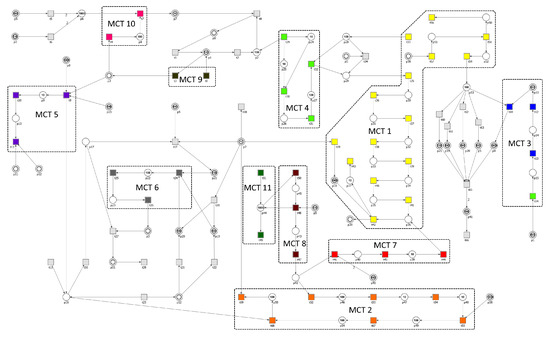 The Petri net-based model with initial marking and MCT sets marked by accordingly labeled rectangles. The transitions within a given MCT set are encoded in the same color. Logical places are depicted as two concentric circles. Places and transitions are represented by their numbers.