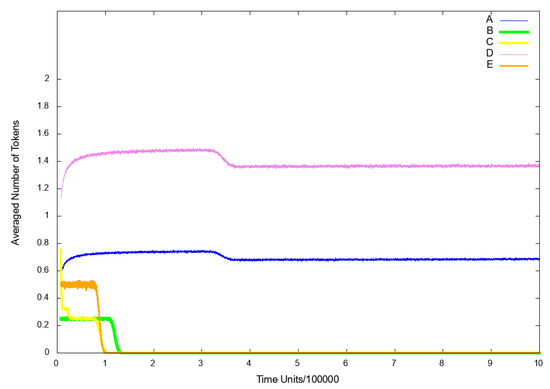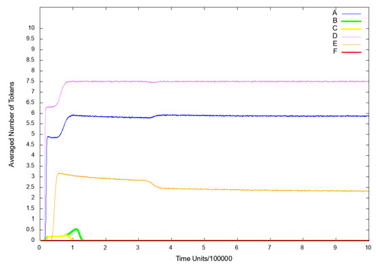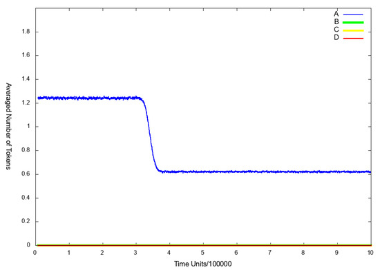 To observe the influence of IL-18 on the analyzed system, we excluded from the model the following transitions: (pro IL-18 activation by caspase 1 enzymatic cleavage) and (induction cell mediated immunity). Firstly, we decided to observe the place (nitric oxide (NO)), since it reflects the risk of atherosclerosis related cardiovascular events, which are connected with higher risk of death. As it can be seen in Figure 4B, if IL-18 is inhibited, cardiovascular disease does not develop.