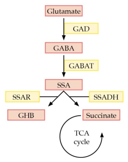 - Malaspina, P.; Roullet, J.B.; Pearl, P.; Ainslie, G.; Vogel, K.; Gibson, K. Succinic semialdehyde dehydrogenase deficiency (SSADHD): Pathophysiological complexity and multifactorial trait associations in a rare monogenic disorder of GABA metabolism. Neurochem. Int. 2016, 99, 72–84. [Google Scholar] [CrossRef] [PubMed]