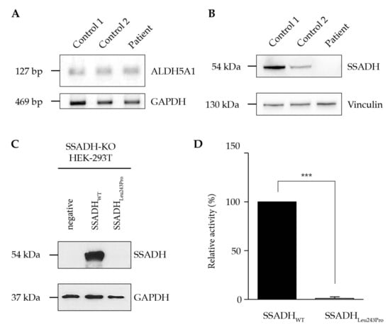 - Menduti, G.; Biamino, E.; Vittorini, R.; Vesco, S.; Puccinelli, M.P.; Porta, F.; Capo, C.; Leo, S.; Ciminelli, B.M.; Iacovelli, F.; et al. Succinic semialdehyde dehydrogenase deficiency: The combination of a novel ALDH5A1 gene mutation and a missense SNP strongly affects SSADH enzyme activity and stability. Mol. Genet. Metab. 2018, 124, 210–215. [Google Scholar] [CrossRef]