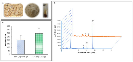 Photos of Lablab purpureus (LPE) (A) bean (i), powder (ii), and extract (iii). Total polyphenol content and flavonoids content (B) extracts of LPE (2 µL of samples). High-performance liquid chromatography (HPLC) (absorbance at 280 nm)—profile of phenolic standards and LPE (C). Peaks: gallic acid (i); catechin (ii); epicatechin (iii); and coumaric acid (iv). The injection volume was 20 µL, and the flow rate was maintained at 0.8 mL/min. All the tests were performed in triplicate.