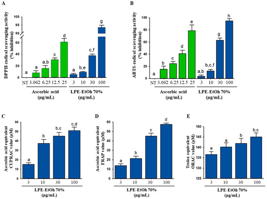 Radical scavenging effects of Lablab purpureus 70% ethanolic extract (LPE) (2 µL). The 2,2-diphenyl-1-picrylhydrazyl (DPPH)-radical scavenging assay (A), ABTS-radical scavenging assay (B), cupric reducing antioxidant capacity (CUPRAC) assay (C), ferric reducing antioxidant power (FRAP) assay (D) were performed determined concentrations of the LPE (3–100 µg/mL), and ascorbic acid were used as standard. The oxygen radical absorbance capacity (ORAC) activities of the samples were calculated by subtracting the area under the blank curve from the area under the sample curve to obtain the net area under the curve (net AUC) (E). Statistical values are expressed as the mean ± SD (n = 3). All the tests were performed in triplicate. Different letters stand for statistically significant each other (p < 0.05) performed by one-way ANOVA followed by Tukey’s test. Green color means ascorbic acid-treated group as a positive control and blue color means sample treated groups (LPE).