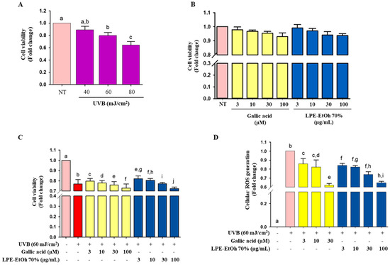 Cell viability activity of ethanolic 70% extract of Lablab purpureus L. (LPE) was evaluated by 3-(4,5-dimethylthiazol-2-yl)-2,5-diphenyltetrazolium bromide (MTT) assay. (A) HaCaT cells were seeded (1 × 105 cells/mL) in 96-well plates for 24 h and then irradiated with UVB (40, 60, and 80 mJ/cm2) followed by incubation for 24 h; (B) HaCaT cells (1 × 105 cells/mL) were treated with 2 μL of LPE ethanolic 70% extract (3–100 μg/mL) and gallic acid (3–100 μM) as a standard for 24 h. (C) HaCaT cells (1 × 105 cells/mL) were treated with LPE (3–100 μg/mL) and GA: gallic acid (10 μM) for 24 h and then irradiated with UVB (60 mJ/cm2). (D) Pretreated HaCaT cells by LPE ethanolic 70% extract (3–100 μg/mL) and gallic acid (3–30 μM) were exposed by UVB irradiation (60 mJ/cm2), reactive oxygen species (ROS) levels were determined according to the Section 4. Statistical values are expressed as the mean ± SD (n = 3). All the tests were performed in triplicate. Different letters stand for statistically significant each other (p < 0.05) performed by one-way ANOVA followed by Tukey’s test. Orange color means non UV-B treated, red color means UV-B treated; yellow color means gallic acid treated; blue color meant sample (LPE) treated groups, respectively.