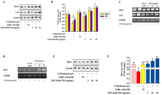 Analysis of primary and phase II antioxidant and detoxifying enzymes. HaCaT cells were pretreated with 2 µL ethanolic 70% extract of Lablab purpureus L. (LPE) for 24 h. Phase I antioxidant enzyme protein expression (A), band intensity analysis (B) and mRNA expression (C) were analyzed by Western blotting, image J software and RT-PCR, respectively. HaCaT cells were pretreated with LPE (3–30 µg/mL) for 24 h. The mRNA levels of phase II antioxidant were measured by RT-PCR (D). Concentration-dependent effects on HO-1 protein levels were analyzed by Western blotting (E) and band intensity analysis was performed by image J software (F). Statistical values are expressed as the mean ± SD (n = 3). All the tests were performed in triplicate. Different letters stand for statistically significant each other (p < 0.05) performed by one-way ANOVA followed by Tukey’s test. Orange color means non UVB-treatment; red color means UVB treatment, yellow color means gallic acid treatment; and blue color means sample (LPE) treatment.