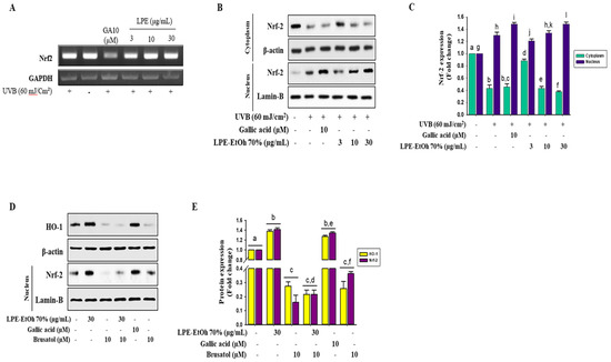Effect of ethanol 70% extract Lablab purpureus L. (LPE) on Nrf2-mediated HO-1 expression. HaCaT cells were pretreated with 2 μL of LPE 30 μg/mL for 24 h and UVB 60 mJ/cm2. The mRNA expression (A) and protein expression of Nrf2 in cytoplasm and nucleus fractions (B) were analyzed by RT-PCR and Western blotting, respectively. Band intensity analysis was performed by image J software (C). HaCaT cells were pretreated with and without LPE 30 μg/mL, gallic acid (10 μM) and Nrf2 inhibitor (brusatol 10 μM) for 24 h and Nrf2 protein from nucleus and HO-1 protein in whole lysate were measured by Western blotting (D). Band intensity analysis was performed by image J software (E). Statistical values are expressed as the mean ± SD (n = 3). All the tests were performed in triplicate. Different letters stand for statistically significant each other (p < 0.05) performed by one-way ANOVA followed by Tukey’s test.