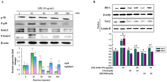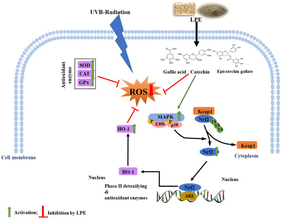 Diver signaling cascades, such as MAP kinase and PI3K/AKT pathways, are associated with the Nrf2/Keap1/ARE system and are known to regulate phase II gene expression [44,45]. In this study, phosphorylation of ERK1/2 and p38 by LPE was determined over time, ranging from 30 to 360 min (Figure 6A). ERK1/2 and p38 inhibitors substantially inhibited the expression of Nrf2 and HO-1 induced by LPE (Figure 6B). Therefore, the Nrf2 activation induced by LPE is dependent on the activation of ERK and p38. Currently used dietary antioxidants exhibit the ability to activate multiform cellular kinases (MAPKs and PI3K/AKT), which regulate the viability of cells in response to oxidative stress [46]. In the present study, ERK1/2 and p38 inhibitors (UO126 and SB239063, respectively) notably abolished the defensive effects of LPE on UV-B irradiation-induced cell death and ROS generation. Collectively, our results suggest that the activation of ERK1/2 and p38 pathways might be involved in the cytoprotective effects of LPE against oxidative stress (Figure 7).
