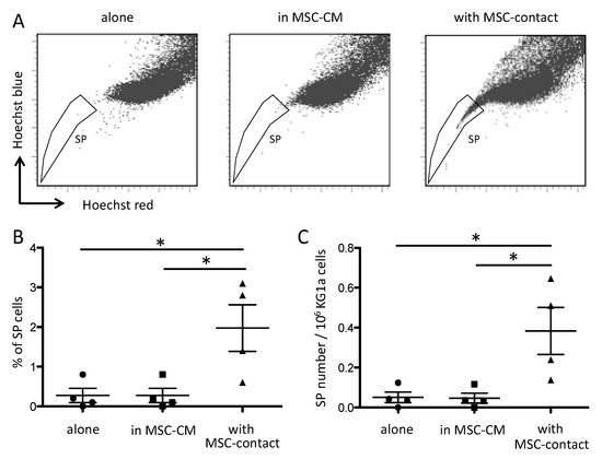 Figure 2. Contact with MSCs increases SP proportion in leukemic cells. SP was assessed by Hoechst efflux measurement in flow cytometry. Cytograms in (A) illustrate a representative acquisition of Hoechst staining of KG1a leukemic cells after a 72 h culture alone (left panel), in MSC-CM (middle panel), or with MSC-contact (right panel). Quantitative results are shown as SP percentages (B) absolute numbers (C) in the three culture conditions (n = 4). * p < 0.05.