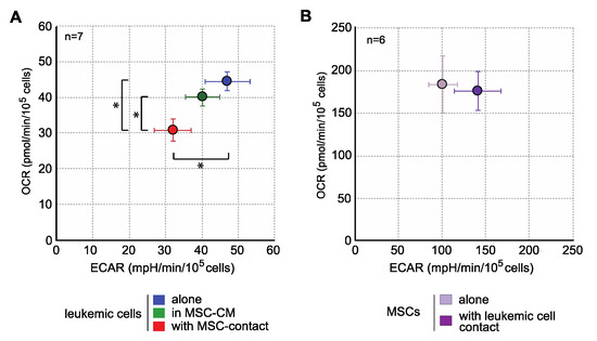 Figure 3. MSCs decrease the energy metabolism of leukemic cells. Energy metabolism was assessed through the evaluation of mitochondrial respiration (OCR) and glycolysis (ECAR) and with Seahorse XFe96 (n = 7). (A) Analysis of energy metabolism in KG1a cells. (B) Analysis of energy metabolism in MSCs. * p < 0.05.