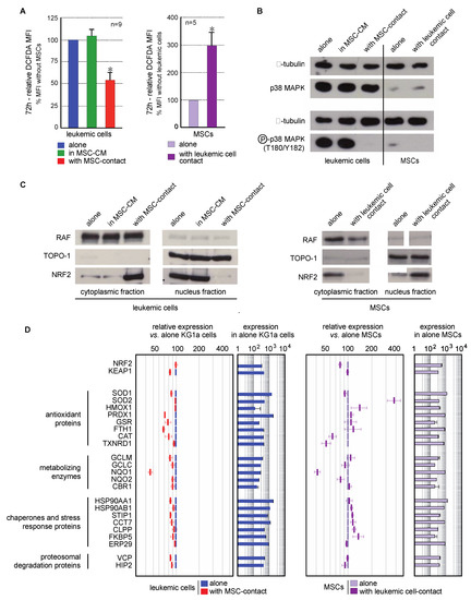 Figure 4. Interaction between leukemic cells and MSCs induces opposite oxidative metabolism and Nrf2 pathway modifications in both cell types. (A) Intracellular ROS level was analyzed by flow cytometry after CM-H2DCFDA staining in leukemic cells cultured alone (blue), with MSC-CM (green), or with MSCs (red) as well as in MSCs cultured alone (violet) or cocultured with KG1a cells (dark violet) for 72h (n = 5–9). (B) The expression and activation of p38MAPK were analyzed by Western blot in KG1a cultured alone, with MSC-CM or cocultured as well as in MSCs alone or cocultured with leukemic cells (n = 3); alpha-tubulin was used as loading control. (C) Nrf2 subcellular localization was analyzed by Western blot in the cytoplasmic and nuclear fractions of leukemic cells (left) or MSCs (right). RAF and TOPO-1 were used as loading controls and purity indicators of the cytoplasmic and nuclear fractions, respectively. (D) Nrf2 target genes expression was evaluated by transcriptomic analysis and is presented as relative expression vs. KG1a cells or MSCs alone (n = 3). * p < 0.05.