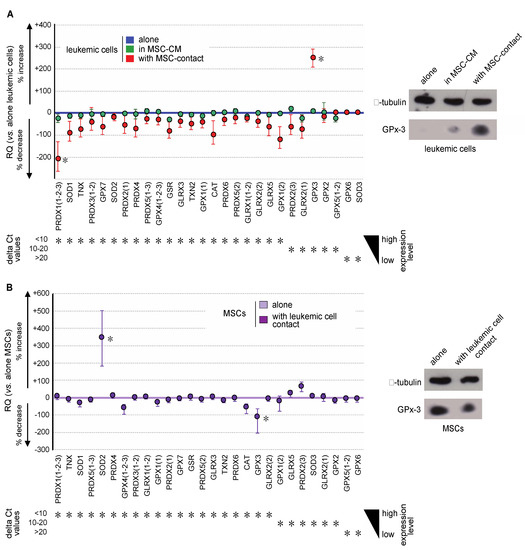 Figure 5. Leukemic cells and MSCs reciprocally modify their gene expression profile of antioxidant enzymes. (A) Gene expression of the major antioxidant enzymes was analyzed by real-time PCR in KG1a cells and is presented, from the highest to the lowest expressed genes in KG1a cells, as the percentage of increased or decreased relative expression (RQ = 2−ΔΔCt) in KG1a cells cultured in MSC-CM (green dots) or cocultured with MSCs (red dots) vs. KG1a cells alone (blue line) (left). Increased GPX3 expression was studied at the protein level by Western blot analysis (right), alpha-tubulin being used as loading control. (B) Gene expression of major antioxidant enzymes was analyzed by real-time PCR in MSCs and is presented, from the highest to the lowest expressed gene in MSCs alone, as the percentage of increased or decreased relative expression (RQ = 2−ΔΔCt) in cocultured MSCs (violet dots) vs. MSCs alone (violet line) (left). Decreased GPX3 expression was confirmed at the protein level by Western blot analysis (right), alpha-tubulin being used as loading control. * p < 0.05.