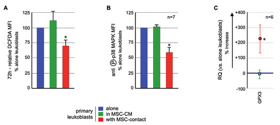 Figure 6. MSCs interact with primary AML cells to modify their ROS levels, p38MAPK activation, and GPX3 expression. Analysis was performed in primary AML cells cultured alone (blue), with MSC-CM (green) or with MSCs (red). (A) ROS levels were analyzed in primary AML cells by flow cytometry after CM-H2DCFDA labelling (n = 13 with MSC-CM; n = 26 with MSC-contact). Primary BM-blasts from 20 AML patients were studied by coculture experiments on normal BM-MSCs from five donors (26 coculture experiments were performed due to various combinations). Seventeen AML patients (among these 20 patients) presented a decrease in ROS levels upon contact with MSCs. Blasts were used no more than three times. As expected, when AML patient blasts were studied on different MSCs, the results were not different, ruling out any MSC batch effect. Whenever possible (sufficient number of blasts), the effect of CM-MSCs was evaluated (n = 13), and in all cases, CM-MSCs did not induce a decrease in ROS levels in AML blasts. All statistics were performed comparing different groups using the Kruskal–Wallis test comparing coculture condition (n = 26), CM-MSCs condition (n = 13) and control condition (blasts alone). (B) p38MAPK expression and activation were studied by flow cytometry after labelling with anti-p38 or anti-phospho (T180/Y182)-p38, respectively (n = 7); (C) GPX3 expression was studied by real-time PCR. Results are presented as percentage of increased or decreased relative GPX3 quantity (RQ = 2−ΔΔCt) in MSC-CM or MSCs cocultured AML cells vs. AML cells cultured alone (n = 6). * p < 0.05.
