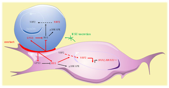 We simultaneously analyzed the effect of the contact of leukemic cells on MSCs. In MSCs, leukemic cells induced a trend to a more glycolytic profile without modification of OCR, in accordance with the glycolytic switch described in the tumor microenvironment [56]. Interestingly, leukemic cells induced a rise of ROS in MSCs. This modification in the redox status of MSCs may impact their functionality, since a defective support of normal hematopoiesis by MSCs stimulated by leukemic cells has been reported [57]. Our group recently highlighted a specific profile of connexins, which are components of gap junctions, in leukemic MSCs [58]. The reversed ROS kinetics, namely drop in leukemic cells and rise in MSCs, may be partly explained by a previously described mechanism of ROS transfer between hematopoietic cells and MSCs by Connexin-43 [59]. The specific role of connexins, particularly connexin-43, should be further explored. Surprisingly, the oxidative stress promoted by leukemic cells in MSCs was not associated with an increased phosphorylation of p38MAPK. Independent regulation of p38MAPK activation has nonetheless already been described in the context of oxidative stress, potentially explained by early ROS-induced phosphatase activation [60]. Nrf-2, in MSCs, is predominantly located in the cytoplasm and contact with leukemic cells modifies its subcellular localization, inducing a strong nuclear translocation. Surprisingly, analysis of the expression of Nrf-2 target genes revealed a balanced profile, with overexpression of half of the target genes tested and underexpression of NQO1, TXNRD1, and CAT. The molecular profile of antioxidant enzymes showed that leukemic cells increased the expression of SOD2 while inhibiting the expression of GPX3. Altogether, these data underline the impact of leukemic cells on MSC oxidative metabolism, suggest a pivotal role for Gpx-3 in this process and reinforce previous work reporting remodeling of the bone marrow microenvironment by leukemic cells [61] (Figure 7).