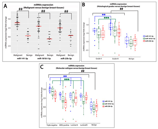 Comparisons of miR-141-3p, miR-181b1-5p, and miR-23b-3p in different groups of breast tissues. (A) Significant high expression levels (p < 0.0001) of miR-141-3p, miR-181b1-5p, and miR-23b-3p were detected in breast cancer tissues in comparison with benign breast fibroadenomas. (B) Significant high expression levels (p < 0.0001) of miR-141-3p, miR-181b1-5p, and miR-23b-3p were detected in grades II and III breast cancer when compared with benign breast fibroadenomas. Moreover, significant high expression (p < 0.05) of miR-141-3p and miR-181b1-5p was associated with high-grade breast tumors (grade III) in comparison to grade II breast cancer. (C) Significant high expression levels of miR-141-3p, miR-181b1-5p, and miR-23b-3p were detected in TNBC, HER2-positive, luminal A, and luminal B compared with benign controls. In addition, significant high expression (p < 0.05) of miR-141-3p and miR-181b1-5p in TNBC was detected compared with HER2-positive, luminal A, and luminal B subtypes. ## indicates significant difference between malignant and benign breast tissues (p < 0.0001), ** indicates significant difference in miR-141-3p expression (p < 0.05), *** indicates significant difference in miR-181b1-5p expression (p < 0.05).