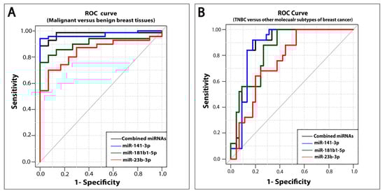 ROC curve analysis of miR-141-3p, miR-181b1-5p, and miR-23b-3p in different groups of breast tissues. (A) ROC curve analysis for miR-141-3p, miR-181b1-5p, and miR-23b-3p expression levels individually and combined to discriminate between patients with breast cancer and benign breast fibroadenomas; (B) ROC curve analysis for miR-141-3p, miR-181b1-5p, and miR-23b-3p individually and combined to distinguish TNBC from other molecular subtypes of breast cancer.