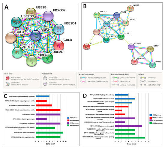 To explore the PPI network of the identified hub genes, all genes in the two candidate modules were uploaded separately to the STRING database. Hub genes of module 1 form a single cluster of highly interconnected PPIs (Figure 3A), while genes of module 2 form two subclusters which are interconnected (Figure 3B). Each network node represents proteins produced by a single, protein-coding gene locus, while edges represent specific and meaningful protein-protein associations that contribute to a shared function. Furthermore, GO annotation and pathway enrichment analysis show the BP, CC, MF, and all the KEGG pathways in which the hub genes of each module were associated (Supplementary Table S3). The three most significant enrichment terms from each category of GO annotation and KEGG pathway enrichment analysis are shown in Figure 3C,D. This analysis revealed that the hub genes of module 1 are significantly involved in the regulation of protein ubiquitination such as ubiquitin–protein transferase activity, ubiquitin–protein ligase activity, and ubiquitin conjugating enzyme activity. Additionally, five genes of this module are highly enriched (FDR = 3.70 × 10−8) in the ubiquitin-mediated proteolysis pathway. On the other hand, hub genes in module 2 are highly involved in bioactive lipid receptor activity, lysophosphatidic acid receptor activity, and G-protein-coupled receptor binding. This module was also found to be significantly enriched with genes of the neuroactive ligand–receptor interaction pathway, pathways in cancer, and Ras-related protein 1 (Rap1) signaling pathways.