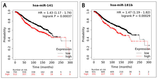 Overall survival curves for miR-141 and miR-181b in 1262 breast cancer patients using the KM plotter miRNA breast cancer online database. Kaplan–Meier curves are plotted for OS of breast cancer patients demonstrating that patients with high expression of (A) miR-141 and (B) miR-181b are associated with shorter overall survival.
