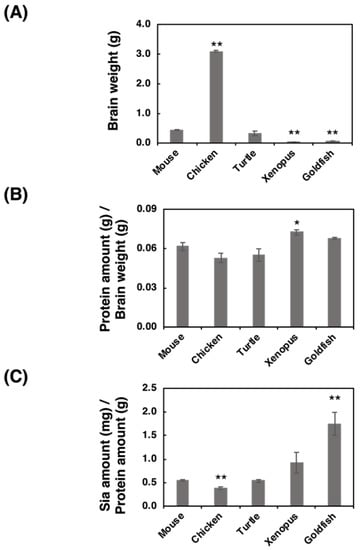 Comparison of brain weight, protein concentration, and Sia concentration for the five different vertebrate brains. Brains from five different vertebrates (mouse, chicken, turtle, xenopus, goldfish, (n = 3)) were used. (A) Comparison of the brain weights of the five vertebrate brains. (B) Protein amount (g) per brain weight (g). Brains were homogenized using lysis buffer, and a bicinchoninic acid (BCA) assay was performed to determine the protein concentration. (C) Sia amount (mg) per protein amount (g). Brain homogenate was treated with a strong acid to achieve hydrolysis of sialylglycoconjugates. All Sia residues were completely released and labeled with 1,2-dimethylenedioxybenzen (DMB). Sia–DMB was separated using a Wako Handy octadecylsilyl (ODS) column (250 mm × 4.6 mm, Wako). The absolute amount of Sia was calculated based on the authentic Neu5Ac. * indicates p < 0.05. ** indicates p < 0.01.