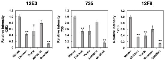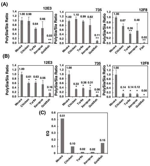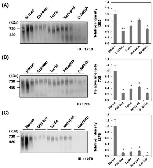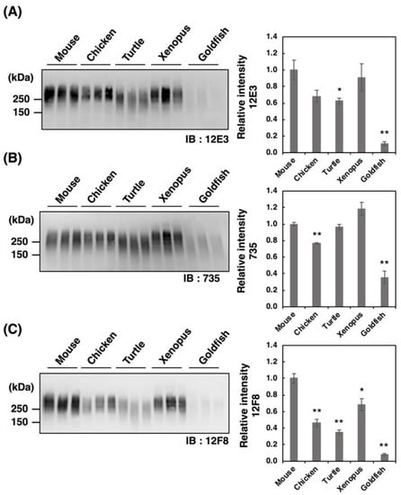 SDS–PAGE/Western blotting of polySia–NCAM derived from five vertebrate brains. Brains from five vertebrates (mouse, chicken, turtle, xenopus, goldfish, n = 3) were used. PolySia expression was analyzed using SDS-PAGE/Western blotting. The brain homogenates were separated by SDS-PAGE (7% polyacrylamide gel) and blotted onto polyvinylidene difluoride (PVDF) membrane (10 µg as protein/lane). The polySia-NCAM was visualized using anti-polySia antibodies, (A) 12E3, (B) 735, and (C) 12F8. The left panel represents the immunoblots. The right panel shows the relative intensity of the anti-polySia antibody. Mouse staining was set to 1.0. * indicates p < 0.05. ** indicates p < 0.01.