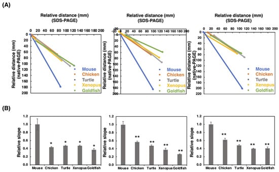 SDS-PAGE/native-PAGE MAP. The S/N MAP of brains from five different vertebrates is described based on the results of blots with each antibody. The results of SDS-PAGE (Figure 2) and native-PAGE (Figure 3) were used. (A) The typical S/N map of 12E3, 735, and 12F8 staining. (B) Relative slope value, K. The value for mouse was set to 1.0. The left, middle, and right panels stand for 12E3, 735, and 12F8, respectively. The values were obtained from the S/N maps from five different vertebrate brains (n = 3). * indicates p < 0.05. ** indicates p < 0.01.