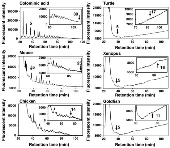 DMB is a specific fluorescent reagent that targets α-keto acids and is applicable for the fluorescent labeling of sialic acids. DMB labeling of the reducing terminus of oligo/polySia chains obtained by mild acid hydrolysis of polySia and subsequent separation of the labeled oligo/polySia on anion-exchange chromatography depending on the degree of polymerization (DP) (MH-FAEC) was first developed by us [39]. Based on this method, we observed the maximum DP of the polySia structure released under mild acid conditions, although the longest DP in the sample may not be precisely defined due to the instability of the polySia chain to mild acidic conditions used for the labeling [2,39]. MH-FAEC of colominic acid yielded comb-like peaks with various DPs, and the maximum DP detected was 39. Under the same conditions, the supernatant obtained by the ethanol precipitation of crude homogenates of vertebrate brains was analyzed, and the comb-like profiles were obtained (Figure 6). The maximum DPs for mouse, chicken, turtle, xenopus, and goldfish were 25, 14, 17, 16, and 11, respectively. The mouse brain possessed the longest polySia chains and goldfish brain did the shortest. These data were nearly consistent with those obtained by Western blotting (Figure 2 and Figure 3).