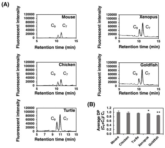 Fluorometric C7/C9 analysis of brain homogenates of five different vertebrate brains. Brains from five vertebrates (mouse, chicken, turtle, xenopus, and goldfish, n = 3) were used. Brain homogenates (20 µg as protein) were subjected to the fluorometric C7/C9 method to measure the average degree of polymerization (DP). (A) Typical chromatograms of C7/C9 analysis of each brain. (B) Relative (C7+C9)/C7 index in each brain. * indicates p < 0.05. ** indicates p < 0.01. Mouse value was set to 1.0.