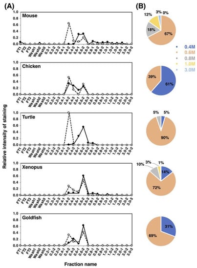 To understand the structural features of native polySia-NCAM of five different vertebrate brains, we performed Sephacryl S-500 gel filtration chromatography. The elution profiles were monitored by native-PAGE/immunostaining using 12E3 (Figure S3A). The polySia staining was categorized into three based on the molecular size, i.e., HMW for more than 720 kDa, MMW for 480–720 kDa, and LMW for lower than 480 kDa. Since the polySia-NCAM is usually migrated at around 250 kDa as a monomer in SDS-PAGE (Figure 2), these three molecular species HMW, MMW, and LMW can be inferred as complex forms of polySia-NCAM, thus tentatively designated as oligomer-polymer, dimer-trimer, and monomer, respectively. The elution profiles of the three molecular species derived from different vertebrate brains are shown in Figure 9. The elution peak of HMW, MMW and LMW of most of the vertebrates can be observed at fraction No. 20, 22, and. 24, respectively. According to the calibration curve, the molecular mass of fractions No. 20., 22, and 24 were supposed to be 2000, 510, and 130 kDa. Elution of HMW bands commenced at No. 12, and the peak was No. 18 in mouse brain. In contrast, the peaks of chicken, turtle, and xenopus brains were observed at No. 20. The peak for goldfish was No. 22. The size of the polySia-NCAM complex derived from mouse was the highest, and that from goldfish was the lowest. The molecular size of polySia-NCAM in HMW of mouse brain is much higher, compared to other vertebrates. MMW were the major polySia-NCAM complex, and the peaks of MMW were eluted between No. 20 and 22. Those of LMW were eluted at No. 22–26, which were corresponded to the monomer of polySia-NCAM. A summary of the molecular mass of the polySia-NCAM is presented in Figure S3B. The difference between the molecular size estimated by native-PAGE and that estimated by gel filtration may arise due to the dissociation of the complex via electrostatic interactions.