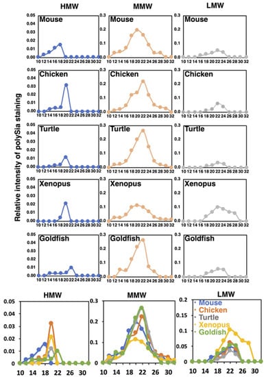 Sephacryl S-500 chromatograms of polySia-NCAM of brain homogenates from five vertebrate brains. Brains from five different vertebrates (mouse, chicken, turtle, xenopus, and goldfish, n = 1) were analyzed by the gel filtration. The elution profiles were monitored by native-PAGE/Western blotting of each fraction using 12E3 (Figure S3A). The left, middle, and right panels for each animal brain show the elution profiles in the regions of HMW (above 720 kDa), MMW (480–720 kDa), and LMW (less than 480 kDa), respectively. The sum of the intensity of the immunostaining of the fractions was set to 1.0. At the bottom panels, merged images of the profiles for five different vertebrate brains are shown.